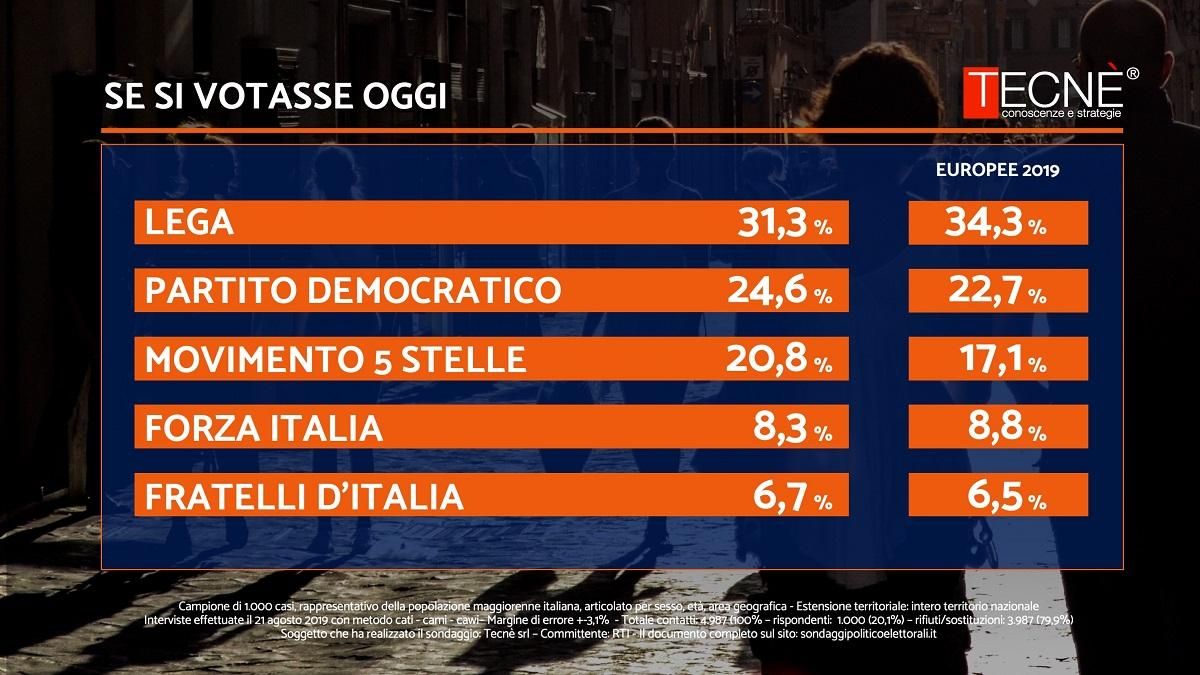 Sondaggio Tecnè: se si votasse oggi: cala la Lega, crescono Pd e M5s