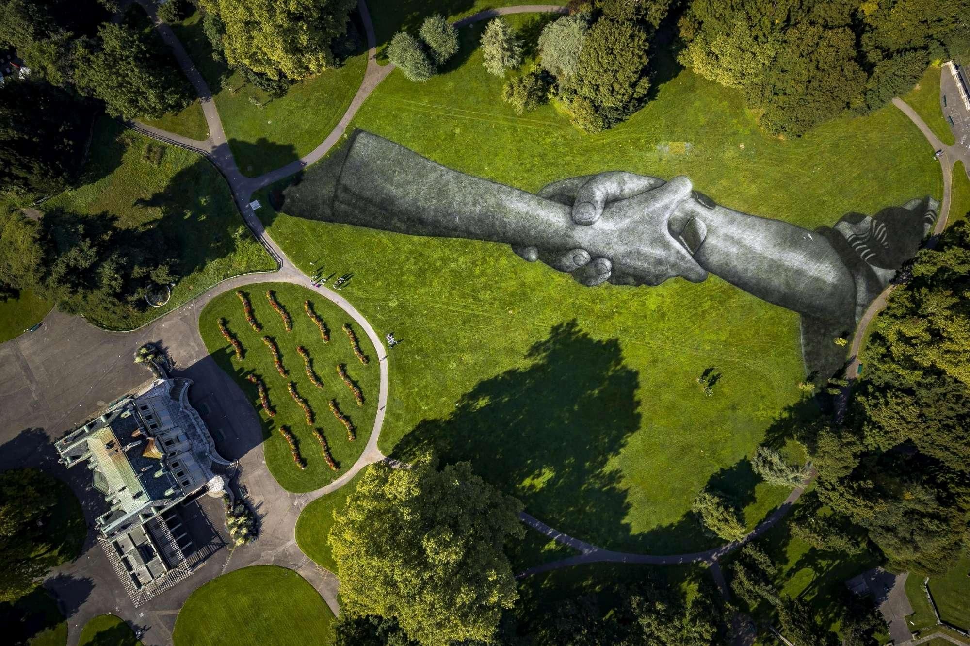 Ginevra, l'artista Saype trasforma il prato in una gigantesca opera d'arte