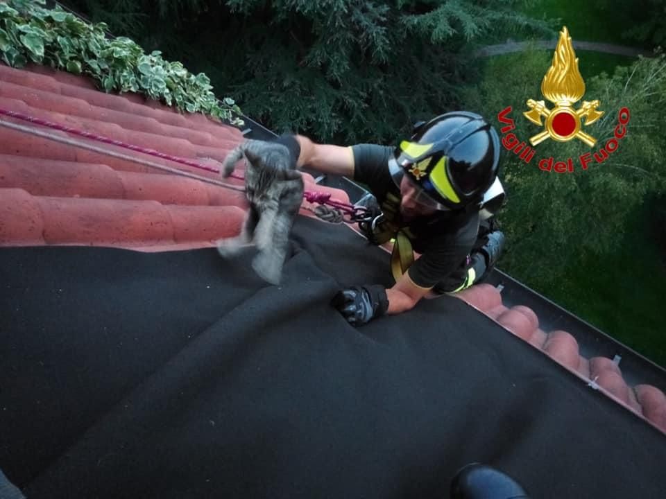 Milano, vigili del fuoco sul tetto per salvare un gattino intrappolato nella gronda del sesto piano