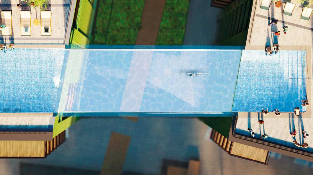 Mentre si galleggia a 35 metri da terra è possibile vedere le persone che passeggiano in strada, ma anche essere visti quando si è in acqua per dare la sensazione ai fortunati che potranno provarla, di fluttuare nell'aria. E' il concept che sta alla base della creazione della Sky Pool, la prima piscina al mondo sospesa tra due palazzi di Londra. Lunga 25 metri, larga 5 e profonda 3, ha già infranto molti record: si estende tra il decimo piano di due grattacieli residenziali nel quartiere di Nine Elms, un'area di lusso che offre una meravigliosa vista della città sulla riva sud del Tamigi. E' la più grande struttura di piscina in acrilico autoportante al mondo ed è opera degli architetti Arup Associates, costruttori anche della Sydney Opera House. Il complesso di appartamenti degli Embassy Gardens conta 2.000 alloggi, con prezzo che parte da più di un milione di sterline per un bilocale. Qui per prima approdò Apple e dopo l’ambasciata americana. Ma per provare a nuotare nel cielo bisognerà aspettare il 19 maggio. Anche se sarà solo una sensazione riservata ai residente dei due palazzi.