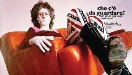 Capelli lunghi e crespi, occhialoni psichedeleci e folte basette. Il volto pitturato di bianco non nasconde un'aria di sfida, mentre, con una gamba accavallata, un giovane Franco Battiato domanda: "Che c'è da guardare? Non avete mai visto un divano?". Era il 1971 quando Milano venne invasa da questi cartelloni pubblicitari che lo ritraevano sprofondato in un sofà di pelle e con un look eccentrico accentuato da pantaloni con lo stendardo a stelle strisce e da un paio di stivaloni da cowboy.