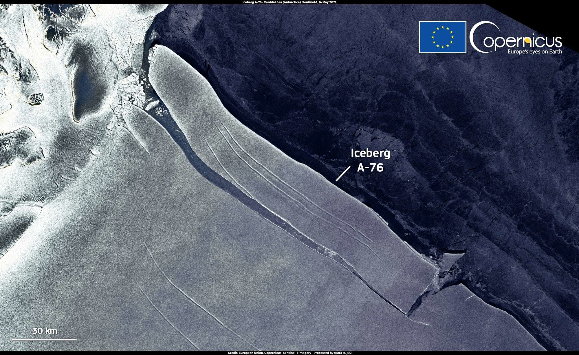 Un enorme iceberg si è staccato dalla calotta glaciale antartica, all'altezza della piattaforma di ghiaccio Filchner-Ronne. Lo afferma sul suo sito l'Agenzia spaziale europea (Esa). L'iceberg, denominato A-76, misura circa 4.320 km2 (170 km di lunghezza e 25 km di larghezza), un'area più grande per esempio di quella dell'isola spagnola di Maiorca, il che attualmente lo rende il più grande del mondo. A-76 è stato recentemente individuato su immagini scattate dalla missione Sentinel-1 di Copernicus, che consiste in due satelliti che inviano dati giorno e notte, consentendo di osservare tutto l'anno aree remote come l'Antartide, spiega l'Esa.