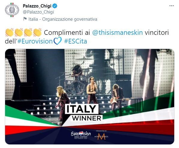 Complimenti ai Maneskin per la vittoria dell'Eurovision song contest dall'account Twitter ufficiale della presidenza del Consiglio. Sui social esulta anche l'ex premier Giuseppe Conte. Non poteva mancare il post dell'ultimo vincitore italiano del concorso canoro europeo, Toto Cutugno. Festeggiano il gruppo romano anche Vasco Rossi e Celentano.