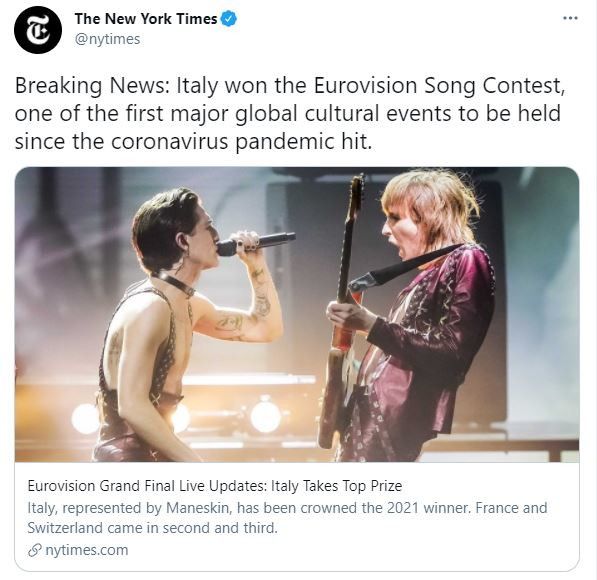 La vittoria dei Maneskin all'Eurovision Song Contest 2021 è stata celebrata dai più importanti giornali internazionali, dal New York Times al Guardian, passando per El Pais e Hollywood Reporter, che hanno dedicato titoli e articoli alla band di Damiano, Victoria, Ethan e Thomas.
