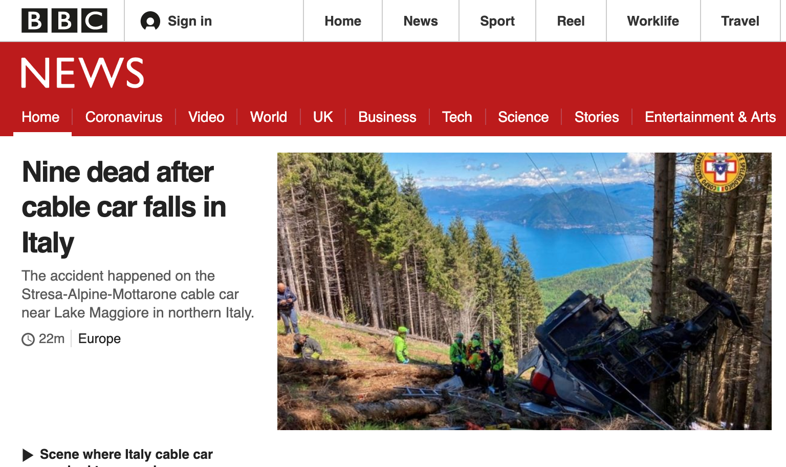 La notizia della tragedia della funivia precipitata in Piemonte è stata rilanciata in tutto il mondo. Il sito del britannico Guardian gli dedica l'apertura e nell'articolo si spiega che "a terra si vede il relitto di una funivia, dopo che è crollato vicino alla sommità della linea Stresa-Mottarone nella regione Piemonte". Apertura anche per la Bbc: "Una funivia crolla vicino al Lago Maggiore". L'emittente pubblica cita un portavoce del soccorso alpino italiano che parla di "incidente molto serio". C'è spazio per l'incidente anche sui media americani. Il Washington Post scrive che "una funivia in cima a una montagna è precipitata nel Nord Italia". E si aggiunge che la linea del cavo era "stata rinnovata nel 2016 e riaperta solo di recente, a causa del coronavirus". Anche la Cnn dedica una "breaking news" all'incidente. Dalla Spagna El País ricostruisce che "il cavo che sosteneva la funivia si è spezzato a 300 metri dall'arrivo, nella parte più alta del percorso". E titola sulle vittime e i "due bambini in condizioni critiche". Il quotidiano francese Le Monde rileva che "le riprese dei vigili del fuoco mostrano i detriti della funivia in una zona boscosa, a cui è difficile accedere a causa della sua ripida pendenza". Dalla Germania la Faz, riportando la notizia, ricorda che "il bel tempo ha attirato molti turisti" nella zona. Del disastro si occupa anche Al Arabiya.