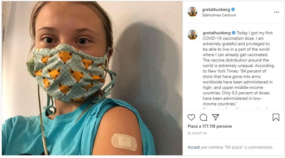 "Oggi ho ricevuto la mia prima dose di vaccino contro il Covid-19. Sono estremamente grata e privilegiata di poter vivere in una parte del mondo in cui posso già vaccinarmi". L'attivista Greta Thunberg sul suo profilo instagram annuncia l'avvenuta vaccinazione e dopo le battaglie ecologiste lancia anche un messaggio sociale legato alla scarsità di vaccini nei Paesi poveri. "La distribuzione dei vaccini nel mondo è estremamente diseguale. Secondo il New York Times l'84% delle dosi in tutto il mondo sono stati somministrati in Paesi ad alto e medio reddito. Solo lo 0,3% delle dosi è stato somministrato nei Paesi a basso reddito”, scrive. "Nessuno è al sicuro finché tutti non sono al sicuro. Ma quando ti viene offerto un vaccino, non esitare. Salva vite".