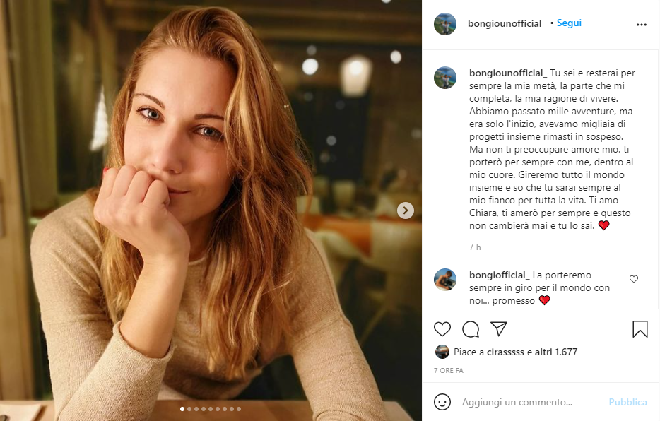 "Sei e resterai per sempre la mia metà, la parte che mi completa, la mia ragione di vivere". Queste le parole che Daniel Bongiovanni, fidanzato di Chiara Ugolini, dedica con un post di Instagram alla 27enne, forse uccisa dal vicino di casa nella sua abitazione a Calmasino, nel veronese. "Abbiamo passato mille avventure, ma era solo l'inizio, avevamo migliaia di progetti insieme rimasti in sospeso. Gireremo tutto il mondo insieme e so che tu sarai sempre al mio fianco per tutta la vita. Ti amo Chiara, ti amerò per sempre e questo non cambierà mai e tu lo sai" - conclude il ragazzo.