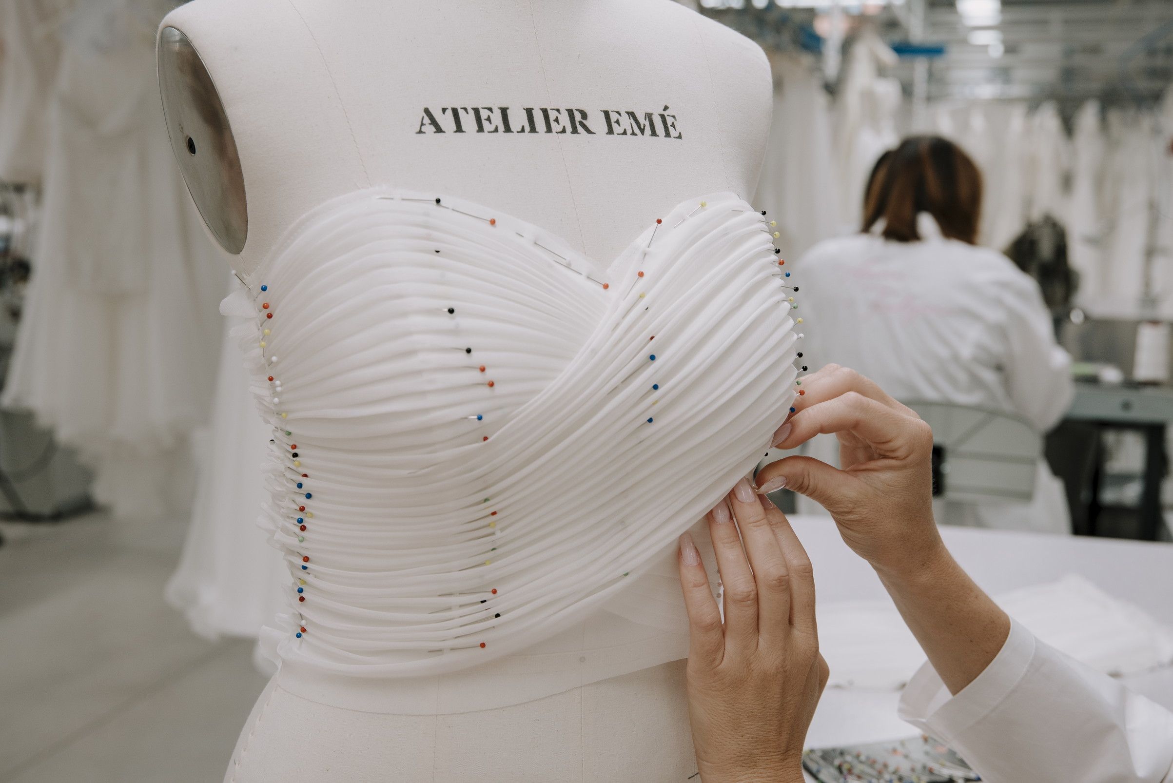 © Ufficio stampa|Atelier Emé | Le finiture degli abiti sono effettuate esclusivamente a mano tramite cuciture invisibili sul capo finito per adattarsi a tutte le richieste della sposa