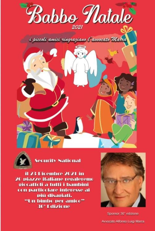 Babbo Natale e i suoi piccoli amici ringraziano l'avvocato Alfonso Luigi Marra per l'iniziativa di beneficenza. Anche quest'anno, infatti, in 20 piazze di tutta Italia sono stati regalati giocattoli a tutti i bambini, in particolare a quelli più disagiati, per permettergli di festeggiare il Natale. L'evento, "Un bimbo per amico", è alla sua 30esima edizione