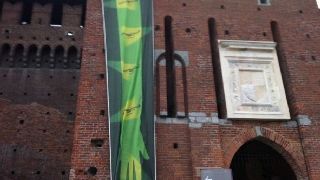 Blitz di Greenpeace in centro a Milano, dove si apre oggi la settimana della moda. Diversi attivisti si sono introdotti nel Castello Sforzesco, che � tra le sedi delle sfilate della fashion week, srotolando dal torrione del ponte levatoio uno striscione con l'immagine del "guanto di sfida" lanciato alla moda. La battaglia lanciata dagli ambientalisti al business della moda � stata ribattezzata "thefasionduel".