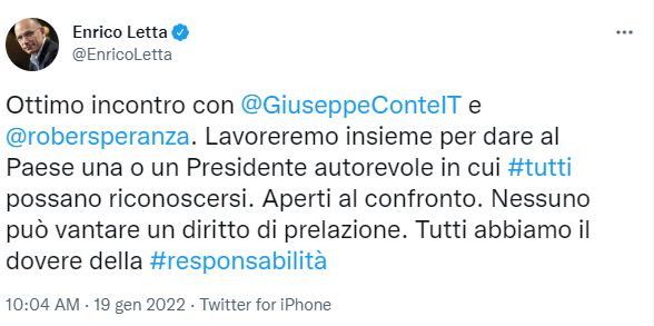 Letta-Conte-Speranza pubblicano lo stesso tweet dopo il vertice sul Quirinale
