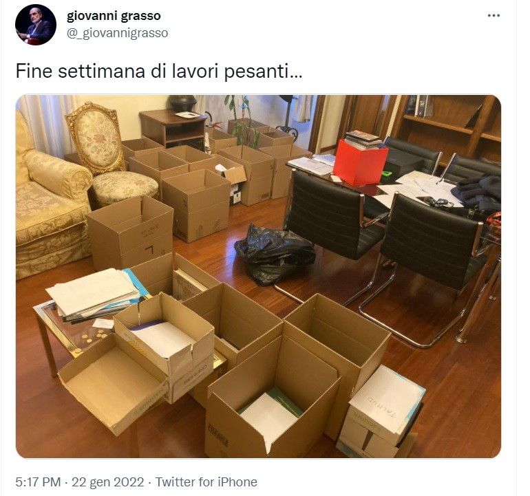 Nelle sale del Quirinale si fa posto al prossimo inquilino. Weekend di scatoloni e traslochi, dunque, per lo staff di Sergio Mattarella, in attesa dell'elezione del nuovo Presidente della Repubblica. E a renderci partecipi dei lavori che fervono nel Palazzo c'è Giovanni Grasso, il portavoce di Mattarella, reso celebre dal famoso fuorionda "presidenziale" prima di uno dei più accorati messaggi al Paese che il Capo dello Stato registrò a inizio pandemia da Covid, il 27 marzo 2020, "Giovanni, anch'io non vado dal barbiere". "Fine settimana di lavori pesanti…", scrive su Twitter proprio Grasso, postando una foto che raffigura gli scatoloni in via di riempimento nella sua stanza al Quirinale. Cambiata, poi, anche l'immagine del profilo sul social network e su whatsapp: via la foto del torrino che svetta sull'ex palazzo dei Papi e spazio a uno scatto che lo ritrae, più personale.