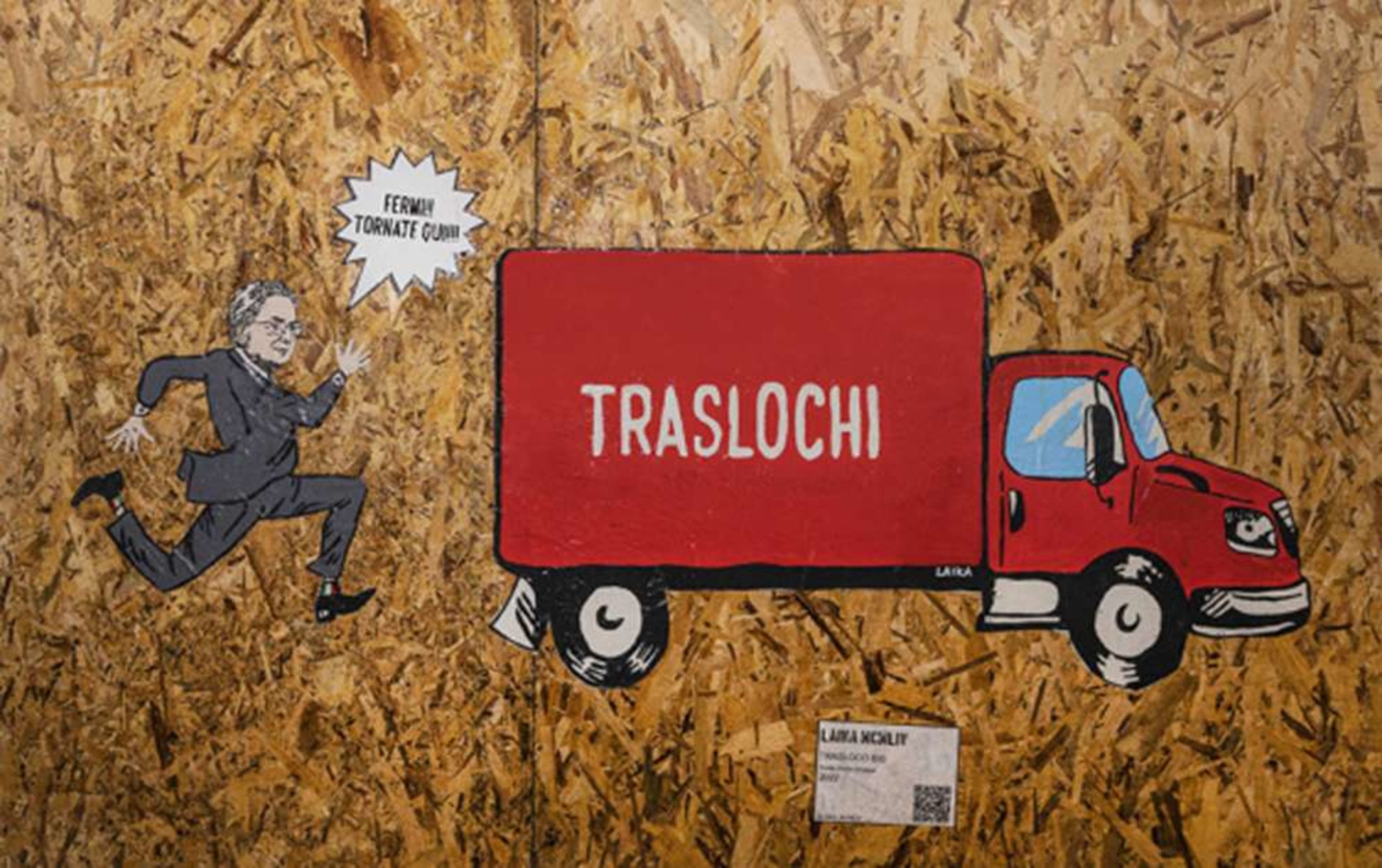 Il camion dei traslochi e Sergio Mattarella che lo insegue chiedendo di tornare indietro. E' questo il nuovo murales dell'arista Laika comparso di notte a Roma, in via della Cordonata, a pochi passi dal Quirinale. Nell'opera, tal titolo "Trasloco Bis" il presidente uscente - ed entrante - rincorre il furgone appena partito, gridando di tornare indietro. "Meglio concentrarsi sull'unica cosa di questa faccenda che mi ha fatto sorridere - il commento dell'artista -. Il presidente alla veneranda età di 80 anni ha traslocato più di uno studente fuorisede".