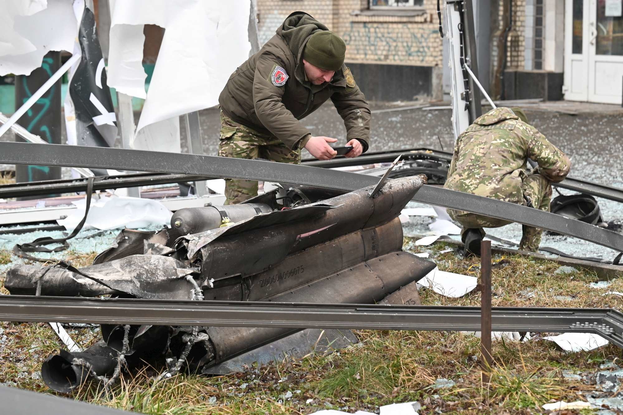 Attacco a Kiev, i resti di un missile russo abbattuto dalla contraerea