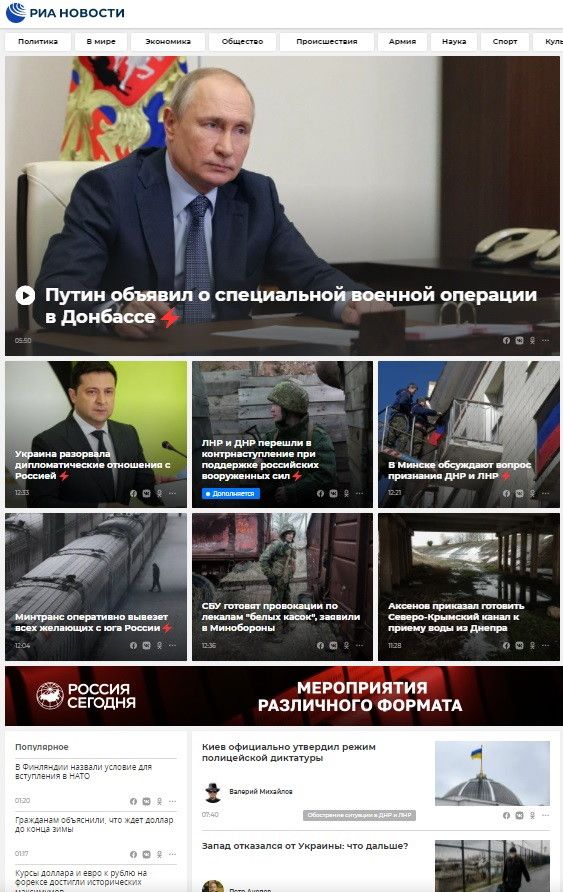 © Dal web|Sull'agenzia di stampa Ria Novosti, dopo l'annuncio dell'attacco dato da Putin, si parla di "controffensiva" delle Repubbliche del Donbass con il supporto delle forze armate russe e dell'evacuazione dal Sud della Russia