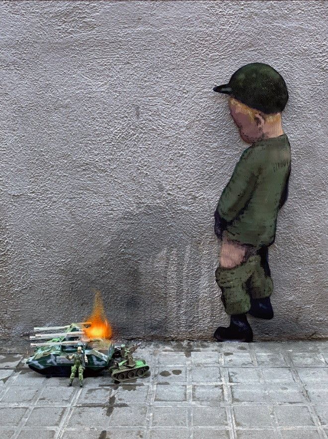 Sul marciapiede le miniature di un carrarmato in fiamme con un soldato e altri mezzi militari, a riportarci alla mente le immagini della distruzione degli armamenti in atto in territorio ucraino e l'orrore della guerra. E sul muro un bimbo soldato che ci urina sopra. Ad accompagnare l'ultima installazione artistica dello street artist TvBoy, postata sulle sue pagine social, la scritta: "Un fuoco da spegnere". E' così che l'artista, sempre attento e pronto alle ultime notizie di attualità, interpreta la guerra del Donbass sui muri di Roma