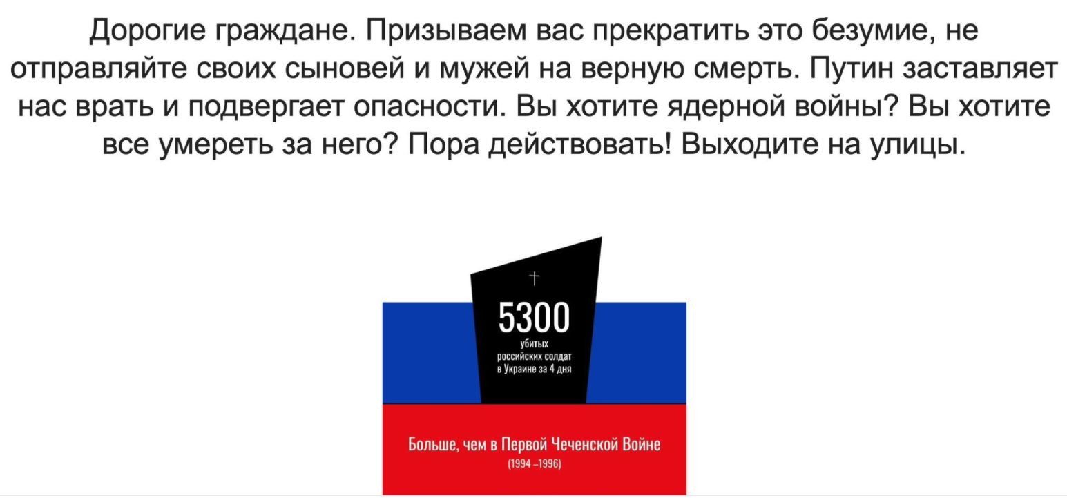 "Cari cittadini. Vi chiediamo di mettere fine a questa follia, non inviate i vostri figli e mariti a morte certa. Putin ci fa mentire e ci mette in pericolo. Siamo isolati dal mondo intero, hanno smesso di comprare petrolio e gas. Tra pochi anni vivremo come in Corea del Nord. Che cosa è ciò per noi? Introdurre Putin nei libri di testo? Questa non è la nostra guerra, fermiamola! Questo messaggio sarà cancellato e alcuni di noi saranno licenziati o persino incarcerati. Ma non ne possiamo più". È il messaggio comparso all'indirizzo web della testata russa Tass, firmato "Giornalisti indifferenti della Russia" e rivendicato dal gruppo di hacker Anonymous. L'appello è rimasto online alcuni minuti, prima di essere sostituito da un messaggio di errore.