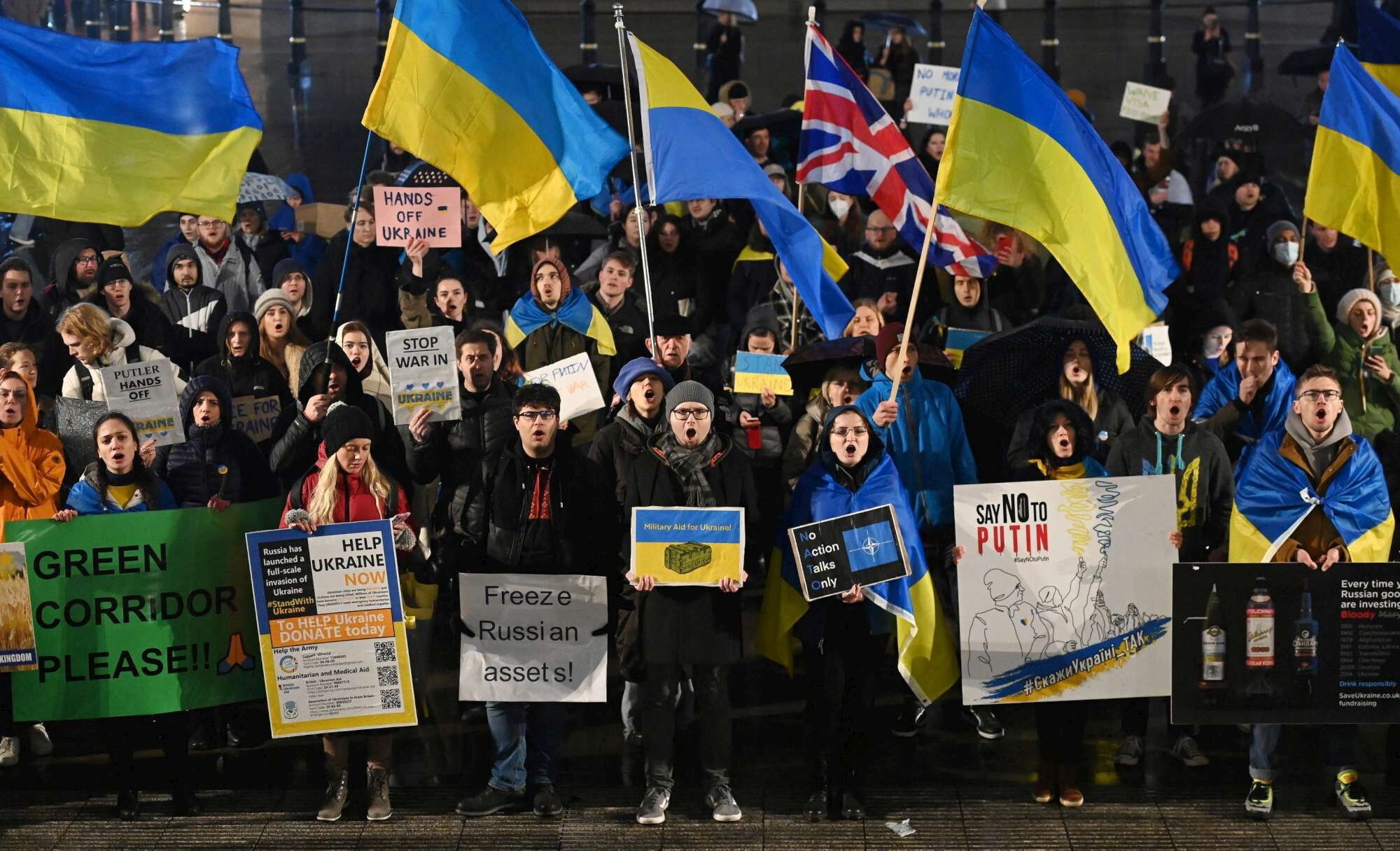 Gli ucraini che vivono in Gran Bretagna si sono radunati nella piazza londinese di Trafalgar Square per protestare contro l'invasione russa dell'Ucraina