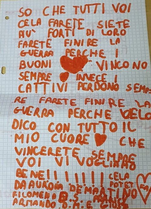 Tutto in stampatello un po' stentato, con un pennarello arancione dalla punta grossa. Di proprio pugno, su un foglio di quaderno a quadretti, una bimba milanese di nome Aurora ha voluto far avere il suo messaggio di pace da consegnare agli ucraini sotto assedio. "Farete finire la guerra perché ve lo dico con tutto il mio cuore", si legge sul biglietto che i volontari della Chiesa Parrocchiale dei Santi Giacomo e Giovanni di via Meda 50 a Milano si sono ritrovati tra i pacchi di aiuti da smistare e da inviare al confine polacco. "So che tutti voi ce la farete - continua il tenero messaggio - perché i buoni vincono sempre e i cattivi perdono sempre". Parole di solidarietà e di una forza straordinaria pronte a partire da Milano alla volta di Kiev.