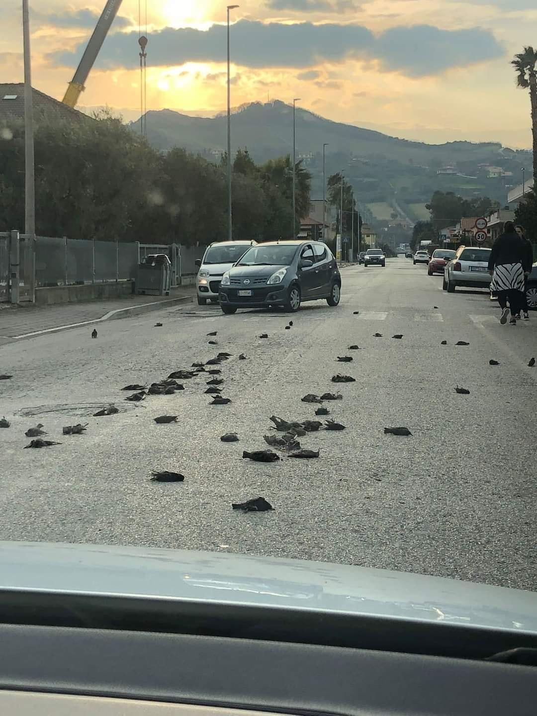 Un centinaio i volatili morti su una strada di Martinsicuro, nel Teramano. L'episodio ha scatenato la curiosità del web: in molti si sono chiesti cosa possa essere successo allo stormo di tordi riverso in strada, alcuni dei quali ancora vivi anche se visibilmente storditi. Sul posto sono arrivati il Servizio veterinario dell'Asl e gli operai del Comune.