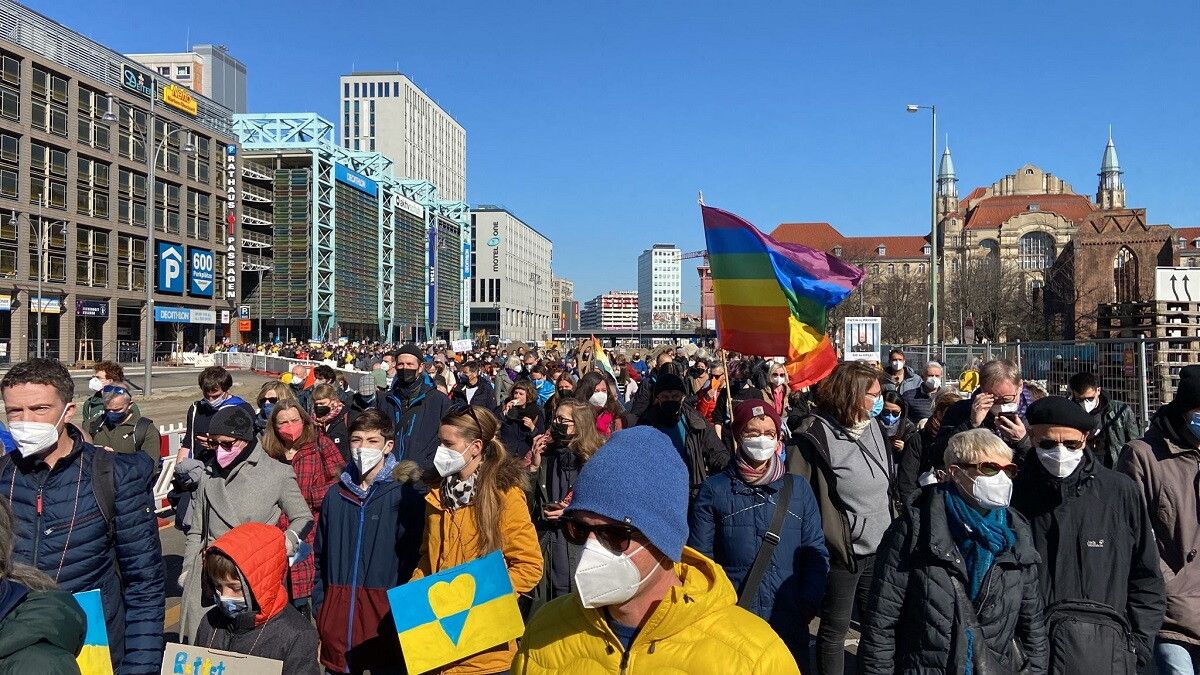 A Berlino un corteo lunghissimo si è snodato da Alexander Platz fino alla Porta di Brandeburgo per dire ancora una volta no alla guerra in Ucraina. Centinaia di bandiere ucraine al vento e cartelli di condanna a Putin. Proprio contro il presidente russo, a Dusseldorf, nella Germania occidentale, i manifestanti muovevano una figura gigante che rappresentava il vorace leader del Cremlino mentre ingoia l'Ucraina; il testo recita "Strozzati!". La figura è stata creata dal costruttore francese di carri allegorici Jacques Tilly ed era già comparsa per le strade di Dusseldorf.