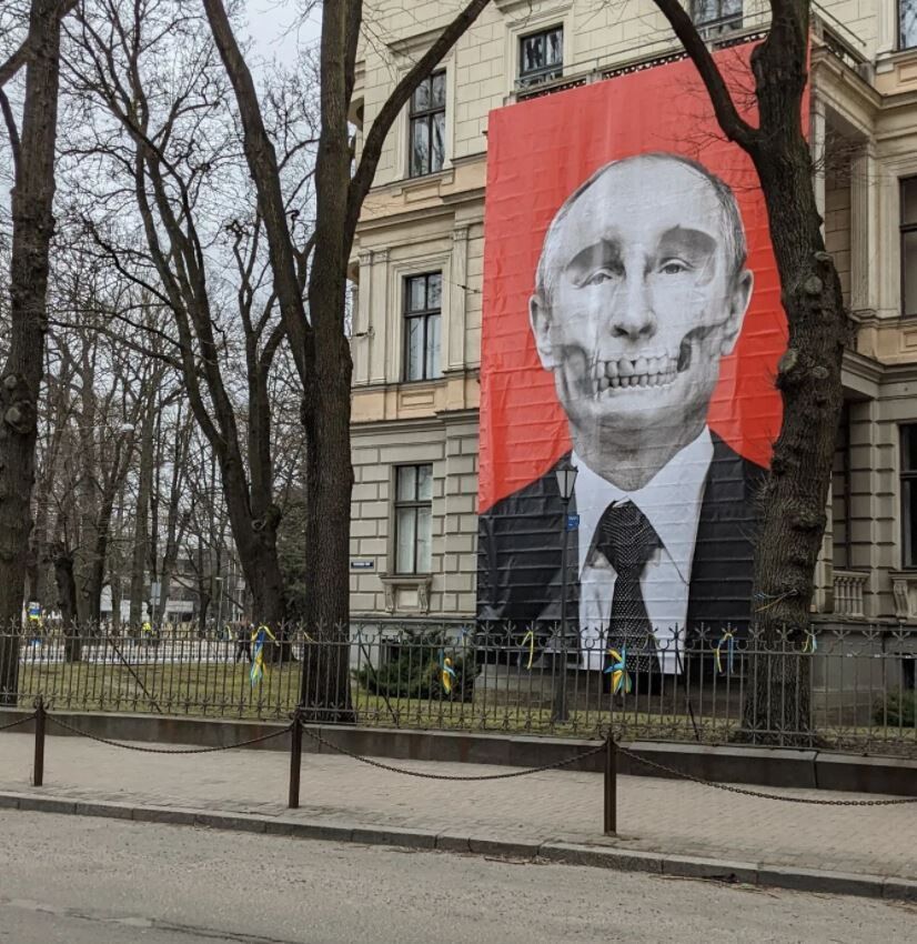 Lettonia, il manifesto contro Putin davanti all'ambasciata russa a Riga