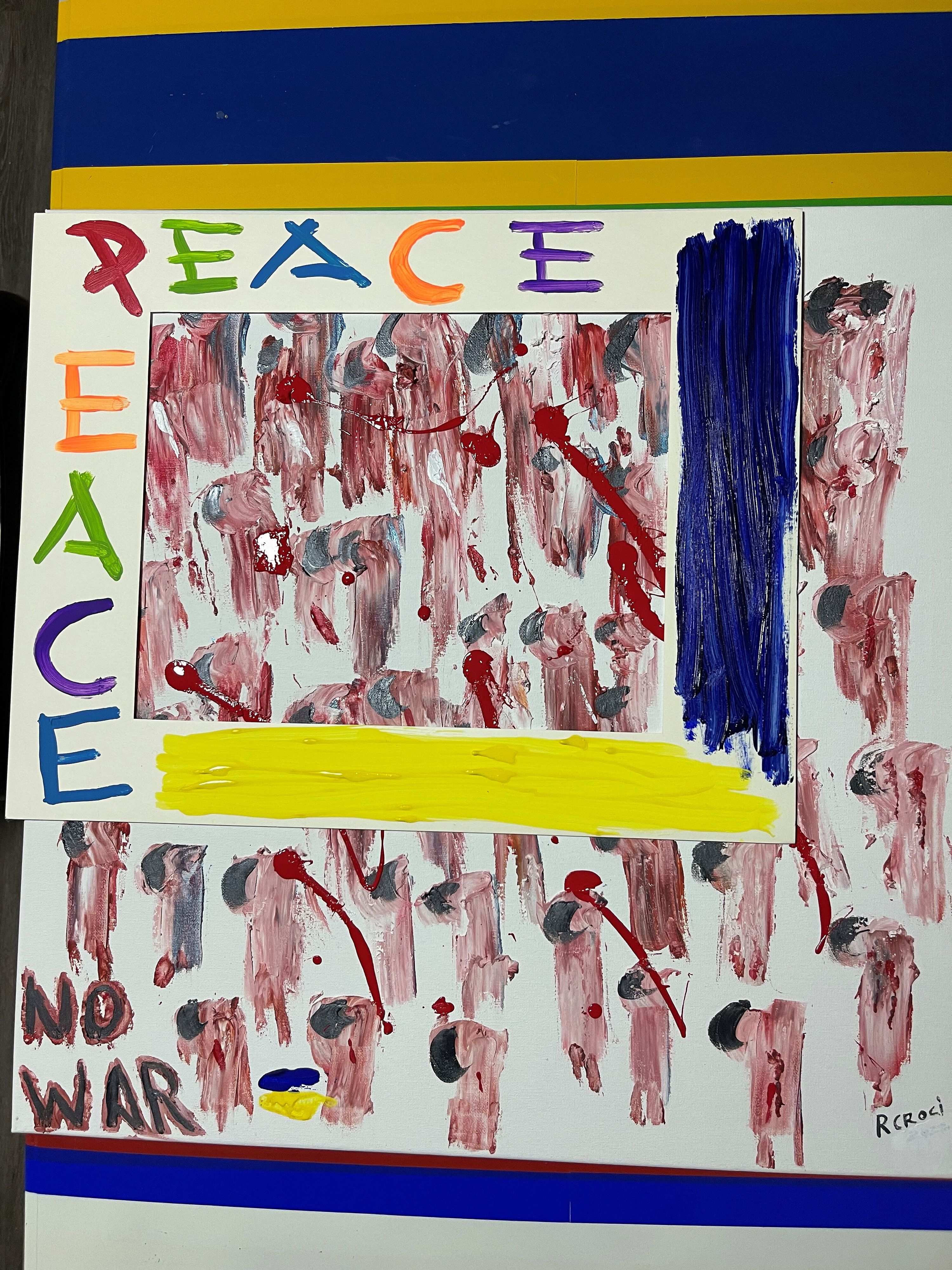 Il giornalista Mediaset Remo Croci ha realizzato un quadro per inneggiare alla pace in Ucraina. "Dopo aver incontrato molto profughi in fuga dalla guerra e registrato, nei servizi dei Tg Mediaset, terribili testimonianze sugli orrori di ciò che hanno visto e subito, ho 'disegnato' la Guerra - spiega Croci -. Il messaggio di questa tela è molto diretto: un disperato grido di cessare il fuoco! Ho invocato oltre al NO WAR anche la richiesta di Pace nella cornice che offre la speranza di Libertà del popolo Ucraino".