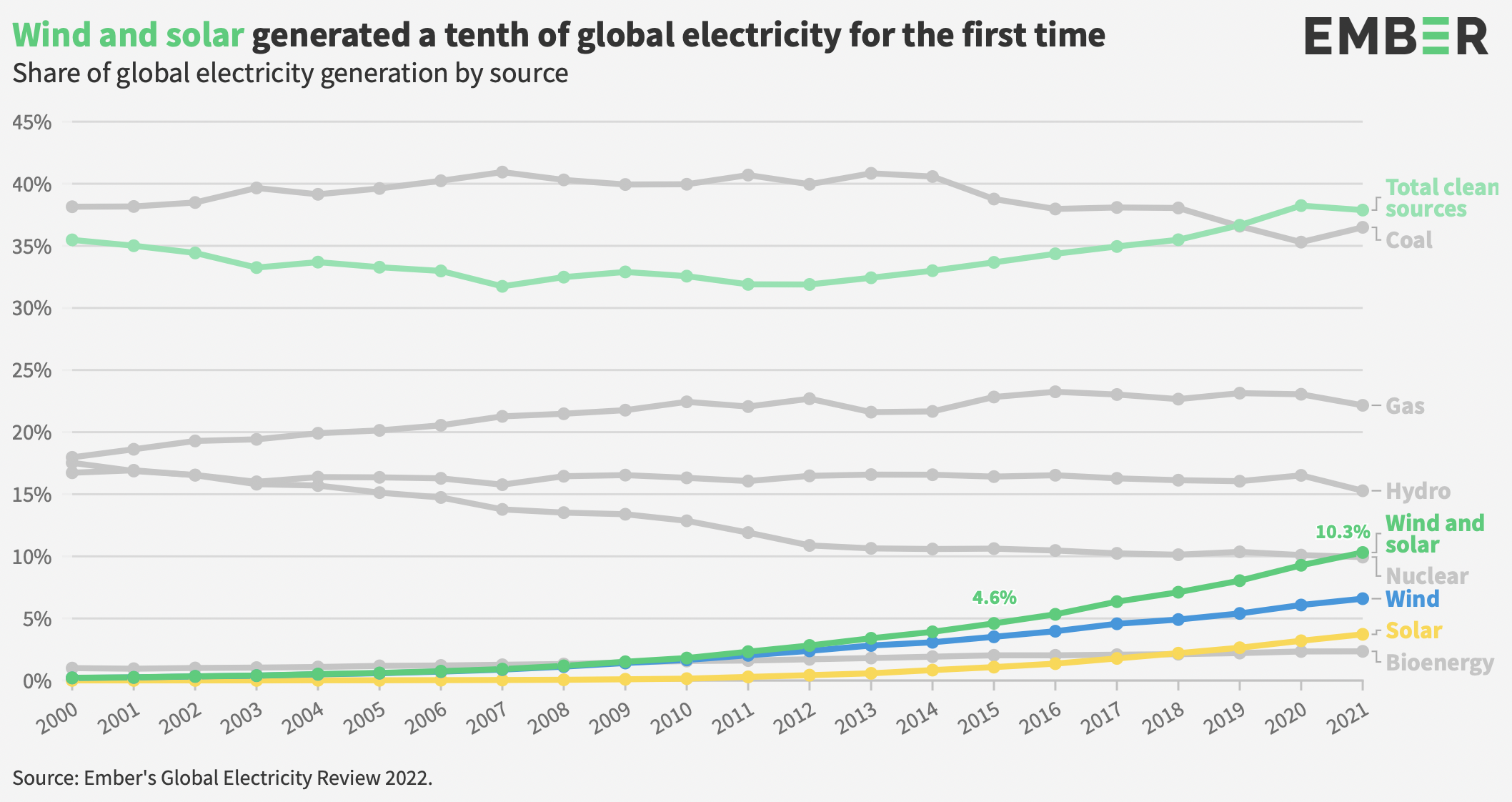 © Ember's Global Electricity Review 2022|La percentuale di utilizzo delle fonti energetiche a livello globale. Eoilico e solare (verde scuro) superano il 10%. Il totale delle fonti rinnovabili (38%) supera il carbone (36%).