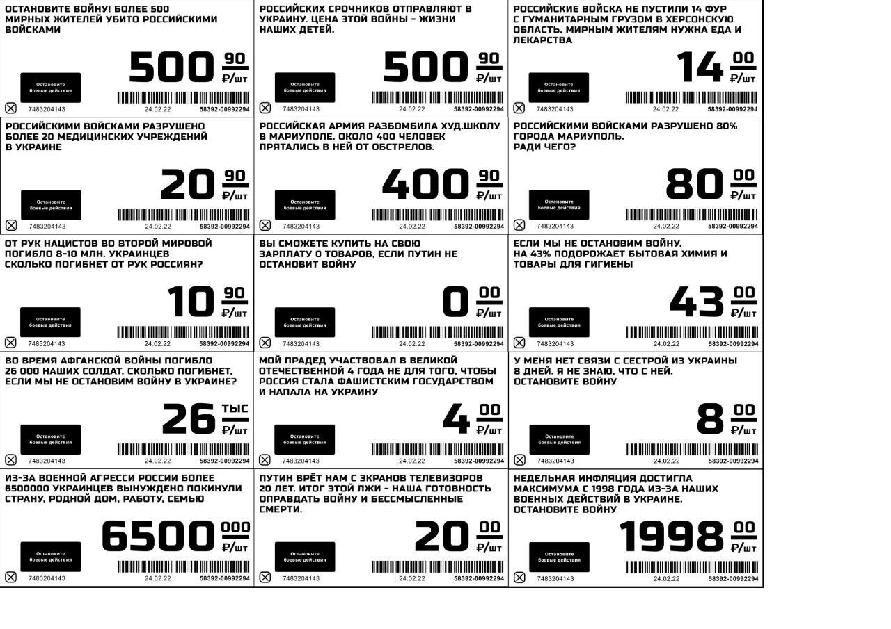 Da un paio di giorni corrono via Telegram nuove iniziative di protesta dei russi che si oppongono alla guerra. E la mobilitazione diventa sempre più creativa, nel tentativo di sfuggire alla stretta delle nuove normative introdotte nella Federazione all'avvio della cosiddetta "operazione militare speciale" In Ucraina. Così, in particolare, i giovani russi, per evitare altra censura, repressioni e carcere, si ingegnano e, dopo i nastri verdi, lo sfoggio di abiti neri a lutto, le scritte "No alla guerra" su monete e banconote, ecco i cartellini dei prezzi "modificati" da applicare sugli scaffali dei supermercati o inserire nei vestiti in vendita nei negozi di abbigliamento. L'obiettivo è far arrivare il messaggio pacifista a più persone possibili nella Federazione, dopo che l'informazione è ormai solo governativa con la sospensione di tutte le testate indipendenti. Ma sulle chat di Telegram non ci si arrende e si danno le istruzioni su come agire, oltre a mostrare esempi di "nuovi" cartellini e codici a barre da stampare. "Entrare nel supermercato con la mascherina, muoversi tra gli scaffali senza dare nell'occhio, fare piccoli acquisti senza usare le carte fedeltà", è la direttiva, mentre per il 2 aprile sono in programma i tradizionali "meeting" di protesta in piazza da Mosca a San Pietroburgo, per continuare a gridare "Niet Voinye" ("No alla guerra", appunto) sfidando le manette