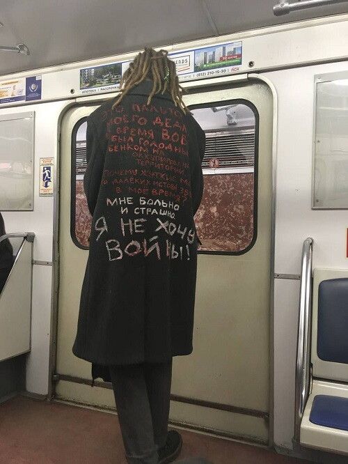 Demyan Bespokoev, 20enne di San Pietroburgo, ha girato per la città russa indossando un cappotto nero con una scritta contro la guerra in Ucraina. La sua fidanzata lo ha fotografato di spalle sulla metropolitana, alla fermata Petrogradskaya, prima che venisse arrestato dalla polizia con l'accusa di aver screditato l'agire dell'esercito russo e di aver disobbedito a un poliziotto. A raccontarlo la giovane al sito locale Bumaga. La scritta sulla schiena del ragazzo recitava: "Questo è il cappotto di mio nonno. Durante la Seconda guerra mondiale era un bambino affamato nei territori occupati. Perché eco inquietanti delle sue storie lontane risuonano ai miei tempi? Sono ferito e spaventato. Non voglio la guerra"