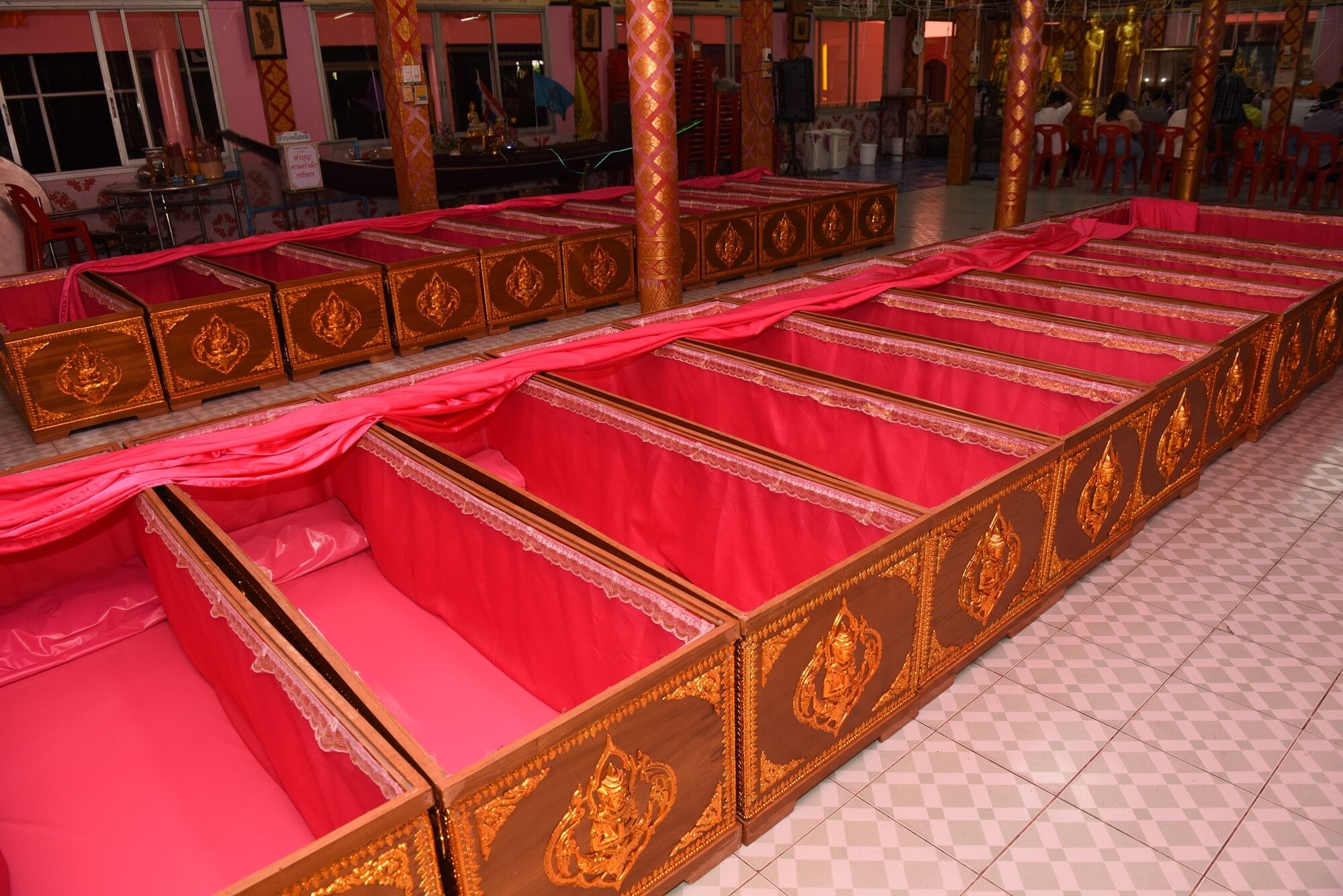 La bara è ovunque un simbolo di lutto, ma in alcune circostanze può diventare uno strumento beneaugurante. È questo il senso di una cerimonia che si tiene al tempio buddista di Wat Takhian, in Thailandia, dove i fedeli si sdraiano nelle bare per pregare nel corso di un rito che si ritiene possa allontanare la sfortuna e donare longevità. Durante la funzione, i fedeli sono anche "connessi" tra loro attraverso una ragnatela di stringhe che hanno la funzione di amplificare il potere della preghiera.