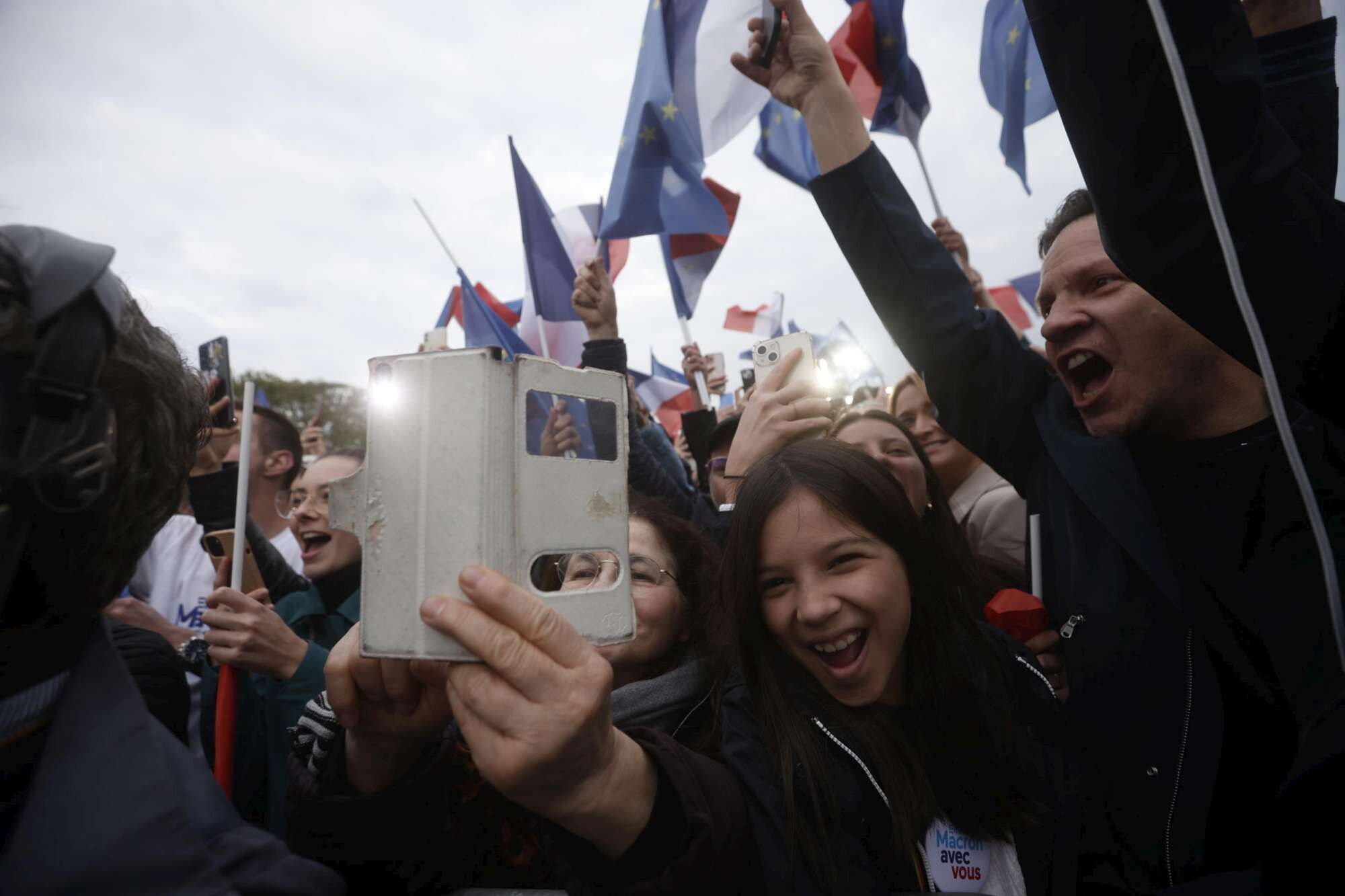 Boato di gioia in un tripudio di bandiere francesi ed europee allo Champ-de-Mars, sotto alla Tour Eiffel, all'annuncio della vittoria di Emmanuel Macron contro la candidata nazionalista Marine Le Pen nella corsa all'Eliseo del 2022. AI piedi del celebre monumento parigino, oltre a tanti militanti pro-Macron, tre suoi ministri, Clément Beaune (Affari europei), Eric Dupont-Moretti (Giustizia) e Jean-Yves Le Drian (Affari Esteri).