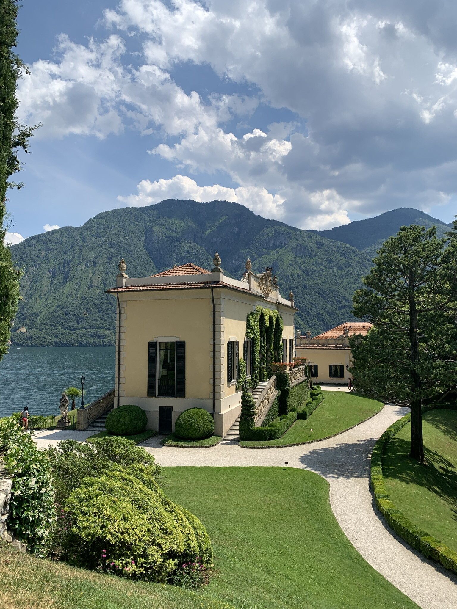 Disegni che stupiscono, viali fiancheggiati da alberi che si alternano a statue, terrazze che sembrano tuffarsi nel lago. La Villa svetta nel panorama come una piccola ma maestosa isola, circondata dall’acqua su tre lati. Un perfetto esempio di equilibrio tra uomo e ambiente.