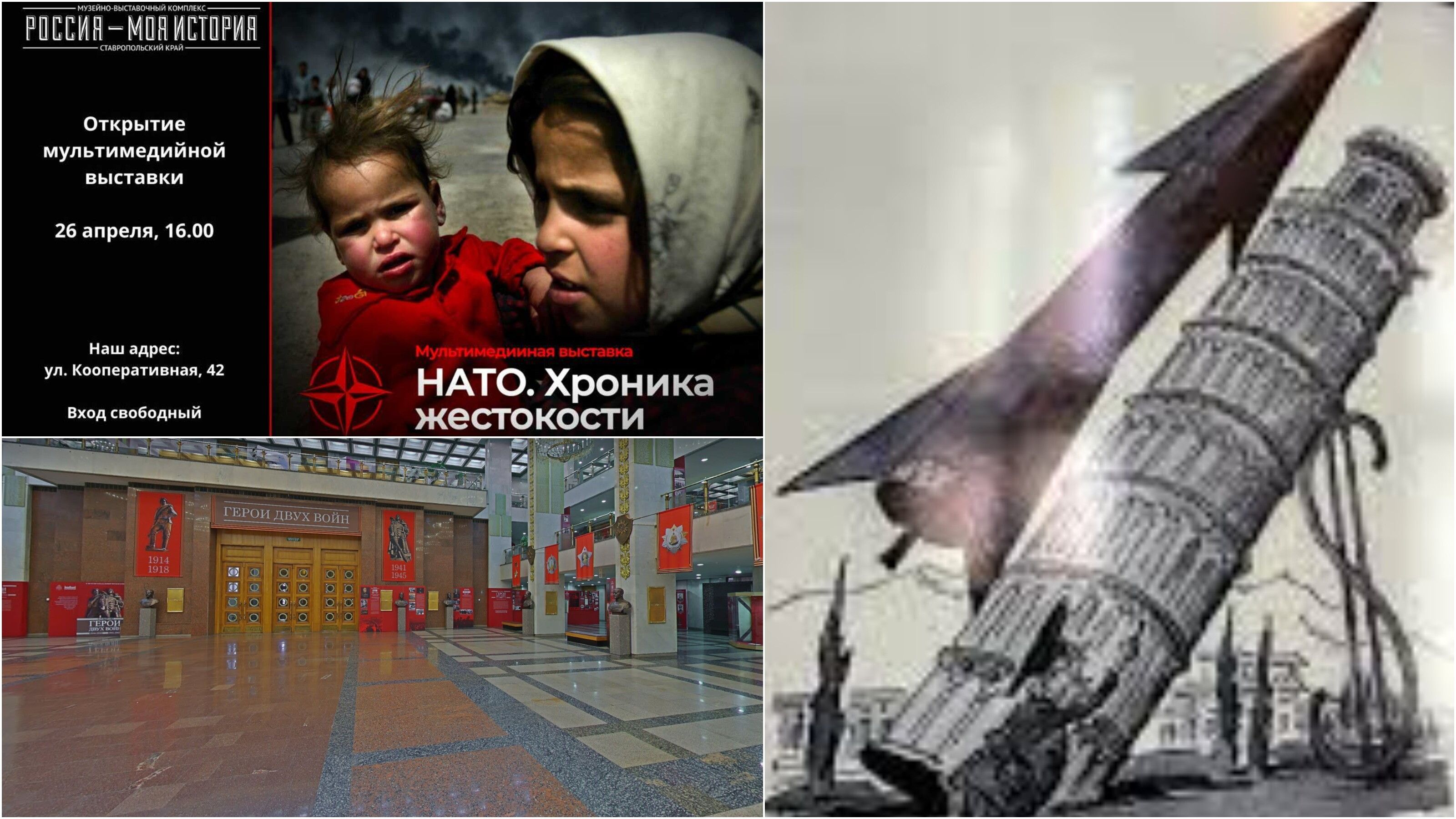 L'esposizione comprende foto d'archivio e filmati delle collezioni di TASS e MIA Rossiya Segodnya, documenti storici, dati ufficiali, nonché manufatti digitali e opere d'arte dalla collezione del Museo di Storia Contemporanea della Russia relativi non solo alla Guerra Fredda ma anche ai conflitti più recenti che hanno visto impegnata la Nato in prima linea: dalla Jugoslavia all'Iraq e all'Afghanistan fino alla Siria.