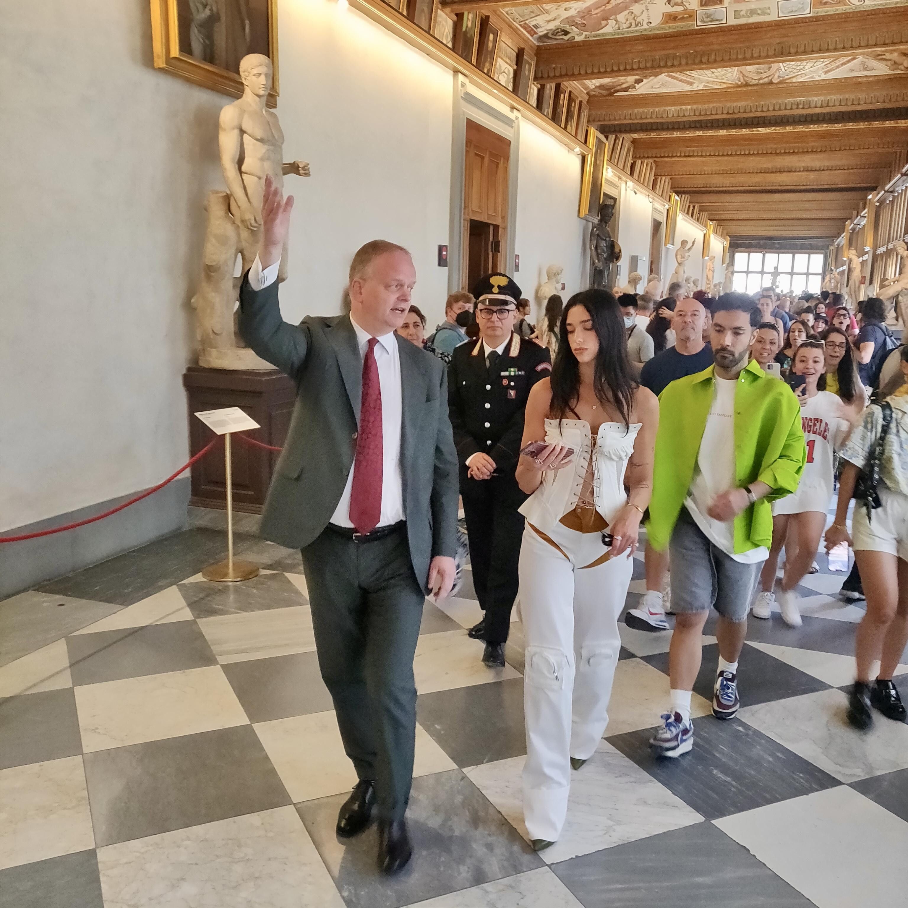 Dopo i concerti di Milano e Bologna, Dua Lipa entra nei panni della turista in Toscana. In visita a Firenze, la cantante (che ha oltre 87 milioni di follower su Instagram) ha fatto un tour completo della Galleria degli Uffizi. È stata la prima volta per la regina del pop tra le opere del museo. Fanno sapere che è rimasta particolarmente affascinata non solo dai dipinti, ma anche dalle grottesche sui soffitti del secondo piano e dalle mappe murali del Terrazzo delle Carte Geografiche. Tanto da voler effettuare, sala per sala, la visita completa, insieme a un gruppo di amici, guidata dal direttore Eike Schmidt alla scoperta di tutti i capolavori, dal primo Rinascimento e Botticelli fino a Caravaggio, passando per Leonardo, Raffaello, Bronzino e Tiziano.