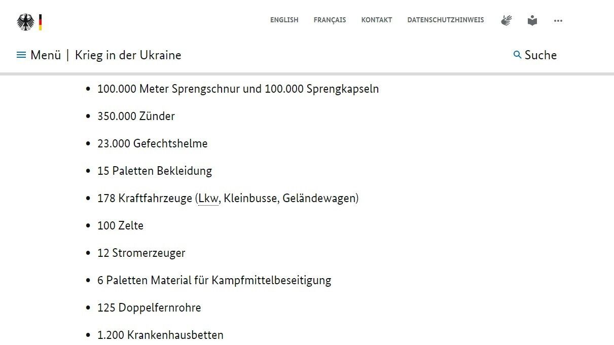 Il governo tedesco ha messo online sul proprio sito una lista degli armamenti che la Germania ha fornito o fornirà all'Ucraina. Berlino ha deciso così di seguire la "prassi dei più stretti alleati, come gli Stati Uniti". La lista comprende sia materiali e armi provenienti dalle scorte della Bundeswehr, sia forniture dell'industria bellica tedesca consegnate grazie ai finanziamenti tedeschi. L'elenco, ha fatto sapere l'esecutivo, sarà aggiornato regolarmente.