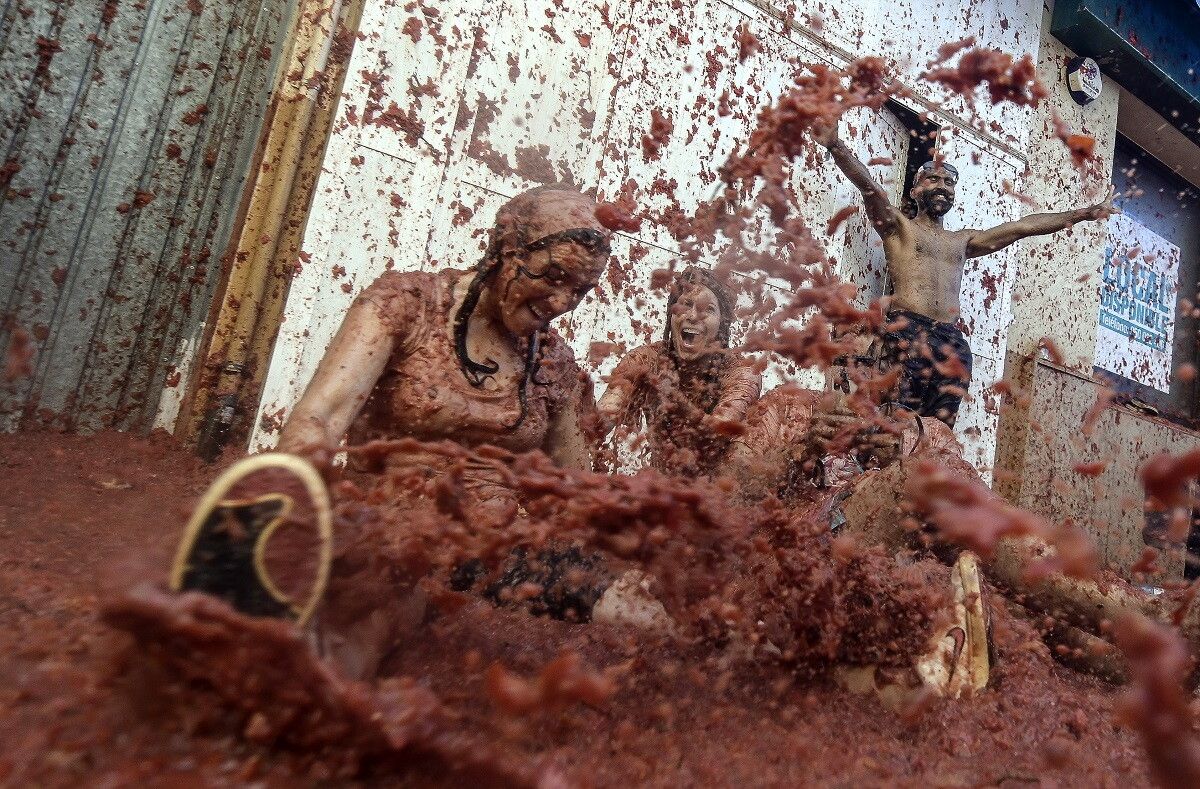 Dopo due anni di stop causa Covid, è tornata la "Tomatina", la goliardica battaglia a suon di pomodori maturi che si celebra in Spagna, nelle strade di Bunol, vicino Valencia, l'ultimo mercoledì di agosto. Ben 130 tonnellate di pomodori sono stati scaricati da sei camion e lanciati per oltre un'ora da tutti contro tutti - circa 15mila partecipanti - tingendo di rosso tutta la città. La tradizionale festa, che ogni anno richiama sempre più turisti, ebbe inizio per caso negli anni '40, quando un gruppo di amici, scherzando tra loro, cominciò a lanciarsi dei pomodori nella piazza principale del comune. Nel 2002 è stata dichiarata festa di interesse turistico.