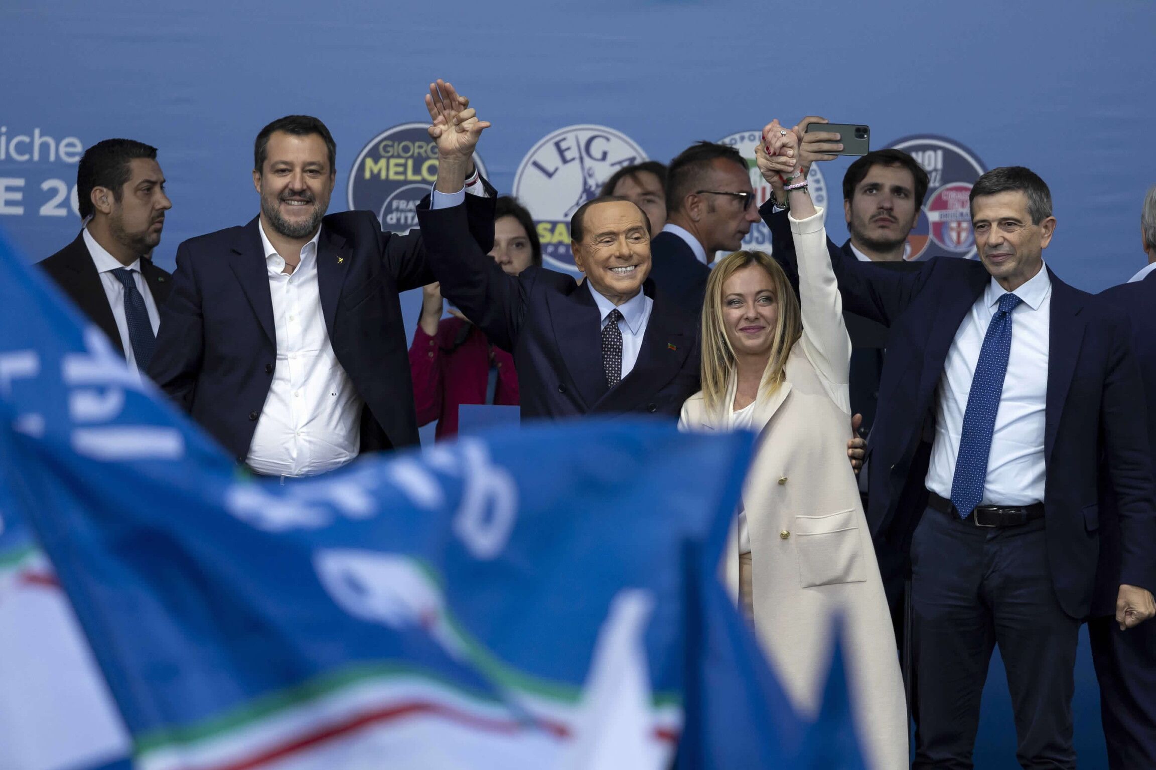 Ecco le immagini della manifestazione del centrodestra, per la chiusura della campagna elettorale, in piazza del Popolo a Roma. Silvio Berlusconi, leader di Forza Italia, Matteo Salvini, della Lega, e Giorgia Meloni, di Fratelli d'Italia, sono di nuovo insieme su uno stesso palco dopo due anni. L'ultima volta era il 24 gennaio 2020 e i tre erano in piazza del Popolo a Ravenna, prima delle Regionali in Emilia-Romagna.