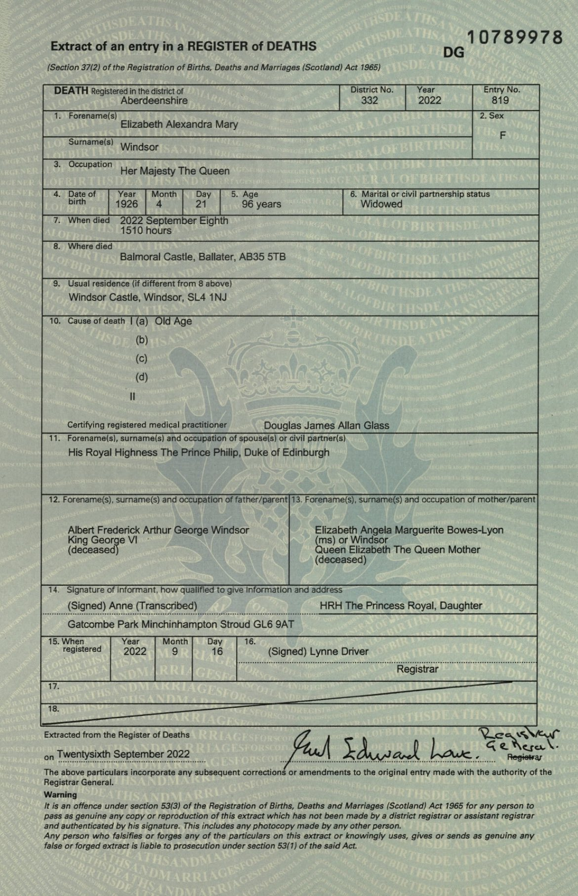 La causa del decesso della eegina Elisabetta II è la vecchiaia. Lo stabilisce il certificato di morte pubblicato dal National Records of Scotland. Nome: Elizabeth Alexandra Mary. Cognome: Windsor. Occupazione: Sua Maestà la Regina. "Morta nel Castello di Balmoral alle 15:15 del 18 settembre di vecchiaia". È quanto si legge nel documento che riporta come data di firma il 26 settembre.