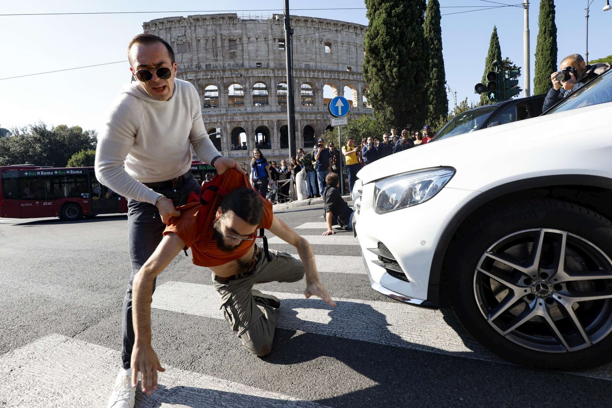Gli attivisti di "Ultima Generazione" hanno bloccato il traffico a via Celio Vibenna in zona Colosseo a Roma. Sul posto è intervenuta la polizia per ristabilire la viabilità. Seduti sulle strisce pedonali i ragazzi del movimento eco ambientalista hanno impedito il passaggio alle macchine per rivendicare la loro battaglia sul cambiamento climatico. "Voglio cambiare quello che la ucciderà tra qualche anno", ripete una delle ragazze rispondendo agli insulti degli automobilisti.