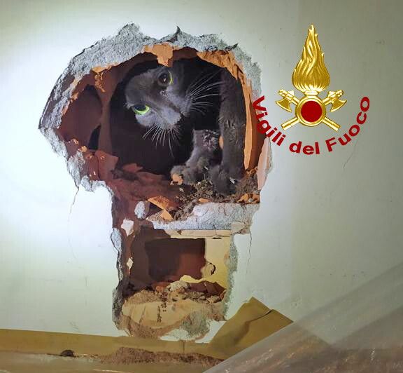 Sentiva dei miagolii in cucina ma non vedeva il gatto. Che sbuca dal muro grazie all'intervento dei vigili del fuoco del comando provinciale di Padova. Disavventura a lieto fine per un certosino che passeggiando sul tetto del palazzo è caduto dentro la canna fumaria per finire nella cucina di un appartamento del terzo piano di un condominio di Este (Padova). O meglio, nel muro della cucina. I vigili del fuoco, allora, individuato il punto, hanno forato la parete e salvato il felino, che è stato adottato dalla stessa famiglia che lo aspettava... al di là del muro.