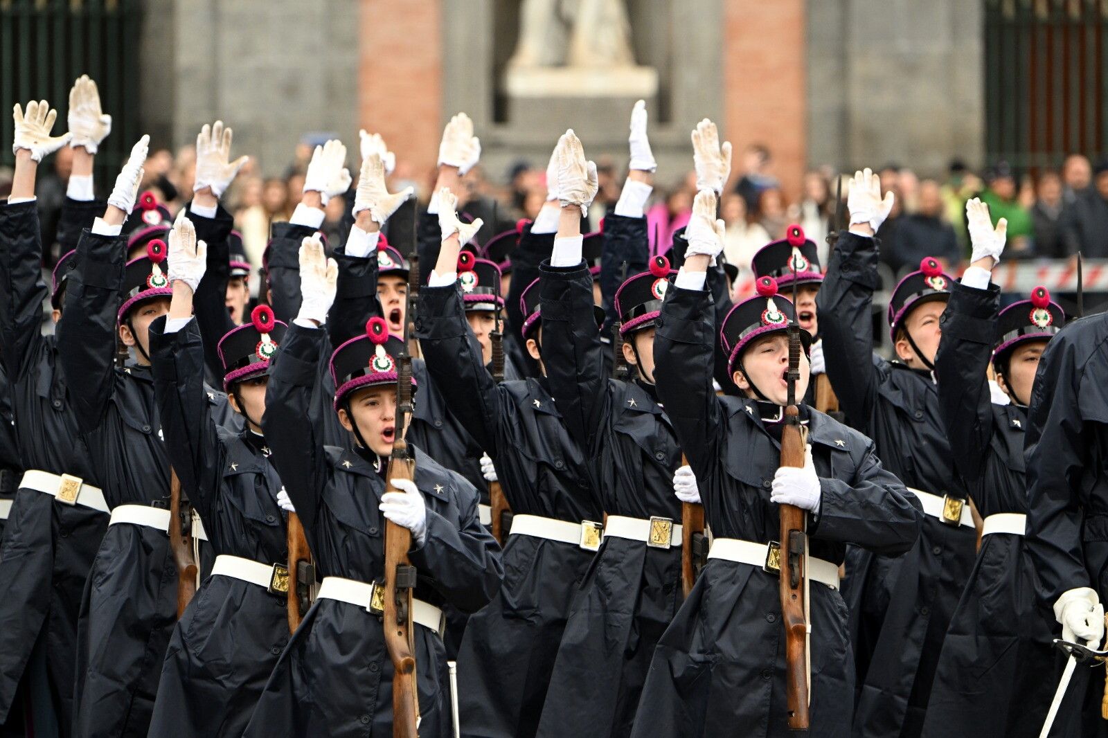 A Napoli, in Piazza del Plebiscito, gli Allievi del 235° Corso Medaglia d’Oro al Valor Militare Capitano Raffaele Tarantini hanno prestato Giuramento di fedeltà alla Repubblica Italiana, alla presenza del Capo di Stato Maggiore dell’Esercito, Generale di Corpo d’Armata Pietro Serino, accompagnato dal Comandante per la Formazione, Specializzazione e Dottrina dell’Esercito, Generale di Corpo d’Armata Carlo Lamanna. Il Giuramento solenne, avvenuto alla presenza della Bandiera d'Istituto e del padrino del Corso, Generale di Corpo d’Armata Medaglia d’Oro al Valor Militare Rosario Aiosa, suggellato con la lettura della tradizionale formula del giuramento, pronunciata dal Comandante della Scuola Militare “Nunziatella”, Colonnello Giuseppe Stellato, sancisce l’ingresso a pieno titolo dei 46 Allievi - 32 uomini e 14 donne - nei ranghi dell’Esercito Italiano. Nel corso del suo intervento il Capo di Stato Maggiore dell’Esercito ha esortato i giovani Allievi: “Portate sempre con voi l’impegno che avete solennemente assunto oggi. Amate e rispettate le nostre Istituzioni e sarete i cittadini di cui l’Italia ha bisogno. Da questo momento siete diventati parte della grande famiglia dell’Esercito Italiano: l’Esercito degli Italiani, al servizio delle Istituzioni e dei cittadini”. Il Generale Serino, ha poi proseguito sottolineando che: “italiano è l’unico aggettivo che può essere associato all’Esercito, perché in questi 161 anni noi abbiamo combattuto sempre e solo servendo il Tricolore nazionale, quello dinanzi al quale avete giurato”.