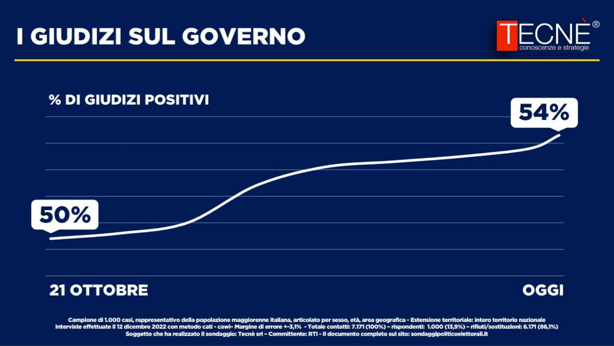 Gli italiani sono soddisfatti delle scelte e delle azioni del governo guidato da Giorgia Meloni. È quanto emerge da un sondaggio realizzato da Tecnè su un campione di mille abitanti, "rappresentativo della popolazione maggiorenne italiana, articolato per sesso, età, area geografica". Il giudizio positivo sull'esecutivo passa dal 50% di ottoreb al 54% di oggi, mente la popolarità del presidente del Consiglio si attesta al 61%. Tra chi conosce i ministri, il più apprezzato è Antonio Tajani (58%).