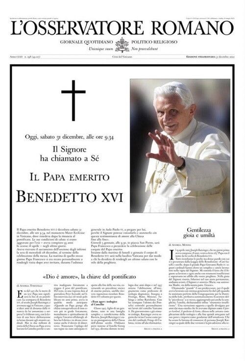 La scomparsa di Benedetto XVI è raccontata e commentata nell'edizione straordinaria realizzata da L'Osservatore Romano, il quotidiano della Santa Sede. Gentilezza, gioia e umiltà è il titolo dell'editoriale firmato da Andrea Monda.