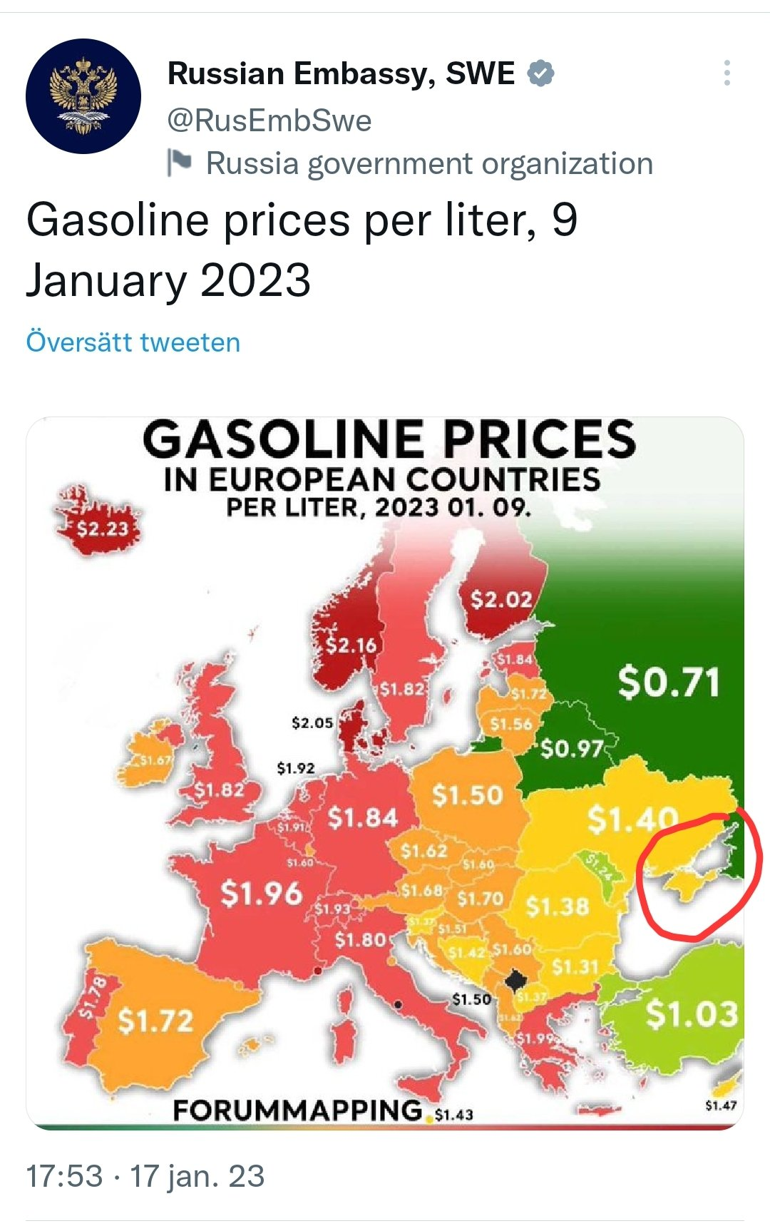 Sulla pagina ufficiale dell'ambasciata russa in Svezia su Twitter è stata pubblicata una mappa che mostra l'Ucraina con i suoi confini riconosciuti a livello internazionale, tra cui Crimea, Donetsk, Lugansk, Kherson e Zaporizhzhia, aree del Paese che la Federazione Russa sostiene di aver annesso. Il post è su Twitter da 14 ore e non è stato rimosso. Lo riferiscono i media ucraini e internazionali pubblicando la mappa che, secondo le intenzioni dell'ambasciata russa serviva a confrontare i prezzi medi del carburante in Europa (senza specificare la fonte dei dati).