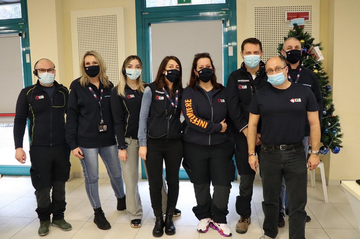© Ansa|L'infermiera Elisa Nava e l'equipe in Centrale 118 che ha assistito in videochiamata la donna che ha partorito il suo terzo figlio prima di arrivare in ospedale a Bentivoglio (Bologna), 8 novembre 2021