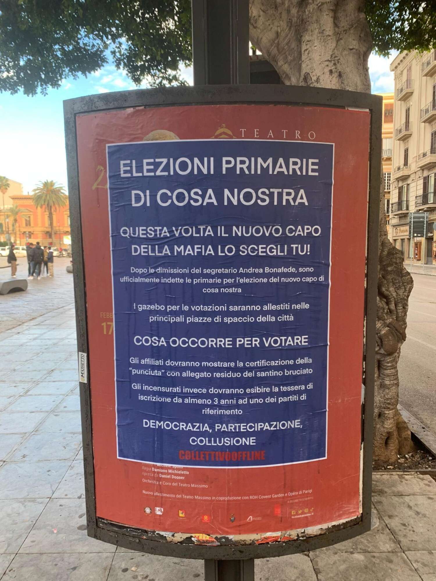 Il collettivo offline corporation torna alla carica dopo l'arresto del boss Matteo Messina Denaro, e attacca in diversi luoghi nel centro di Palermo i manifesti satirici che annunciano le "Elezioni primarie di Cosa nostra". "Questa volta il nuovo capo della mafia lo scegli tu - è scritto sui fogli - Dopo le dimissioni del segretario Andrea Bonafede, sono ufficialmente indette le primarie per l'elezione del nuovo capo di Cosa nostra. I gazebo per le votazioni saranno allestiti nelle principali piazze di spaccio della città". Cosa occorre per votare? scrive il collettivo: "Gli affiliati dovranno mostrare la certificazione della "punciuta" con allegato residuo del santino bruciato. Gli incensurati dovranno invece esibire la tessera di iscrizione da almeno 3 anni ad uno dei partiti di riferimento". E conclude: "Democrazia, partecipazione, collusione".
