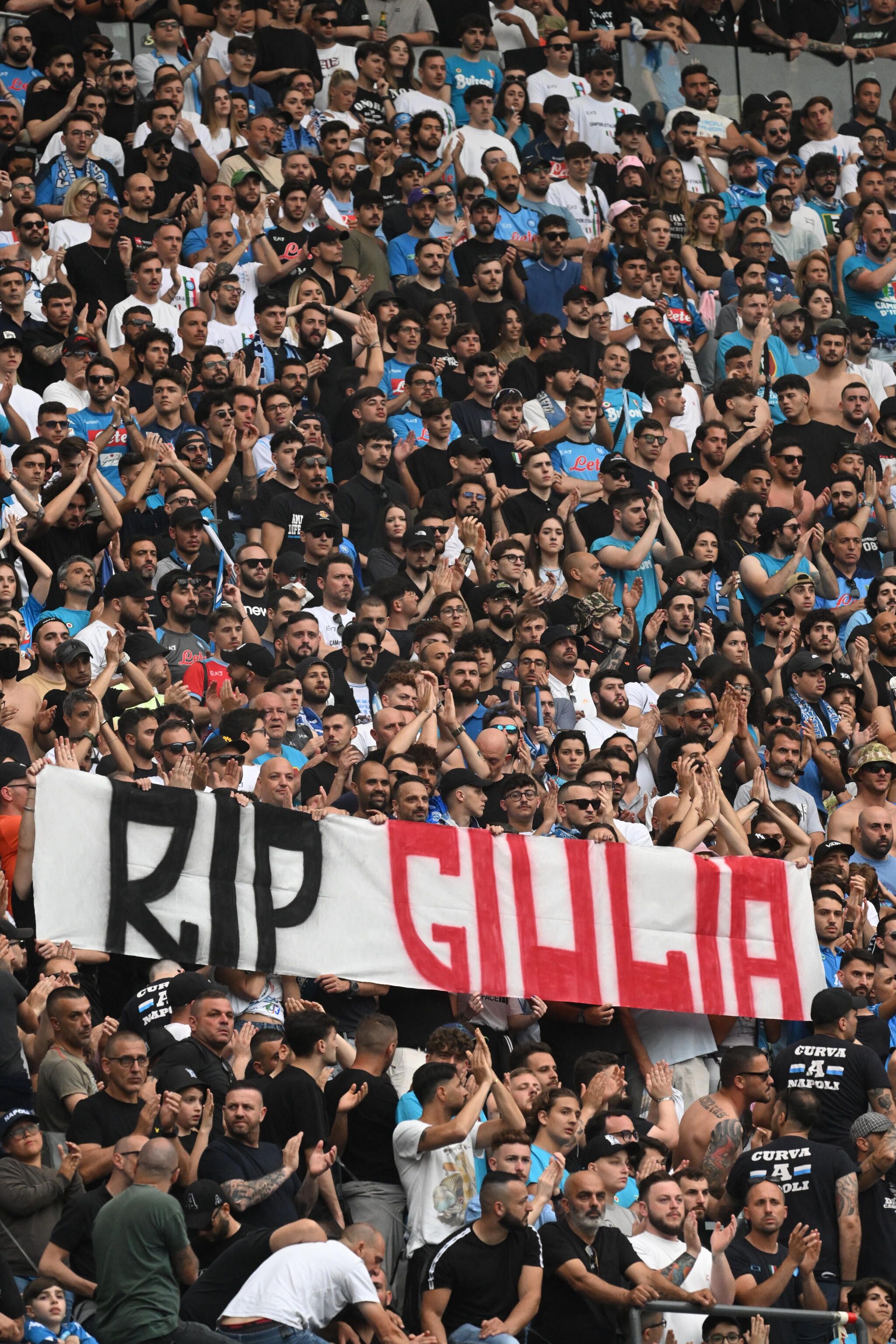 Tra i tanti striscioni dei tifosi partenopei allo stadio Maradona, dove si celebra la festa scudetto del Napoli, ce n'è uno anche per ricordare Giulia Tramontano, la 29enne al settimo mese di gravidanza accoltellata e uccisa a Senago dal fidanzato Alessandro Impagnatiello. "Rip Giulia", c'è scritto a caratteri cubitali.