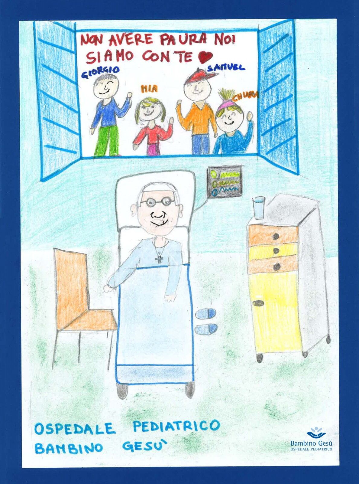 Alcuni piccoli pazienti dell'ospedale pediatrico Bambino Gesù di Roma hanno voluto mandare un messaggio di incoraggiamento a Papa Francesco - che ha subito un intervento chirurgico ed è ricoverato al Gemelli - tramite un disegno. Nell'illustrazione si vede Bergoglio sul letto di ospedale e quattro bambini alla finestra. In alto si legge lo slogan "Non avere paura noi siamo con te".