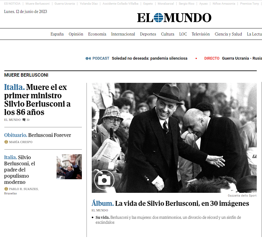 Dall'Europa alla Russia passando per gli Stati Uniti e l'Oriente. La notizia della morte di Silvio Berlusconi apre i siti di informazione di tutto il mondo. Alcuni, come il francese Le Figaro, la britannica Bbc, l'americana Abc, il nipponico, Yomiuri Shinbun e Al Arabyia battono la notizia di cronaca mentre altri come lo spagnolo 'El Pais' o il tedesco 'Der Spiegel' mettono in luce come Berlusconi abbia "segnato" l'Italia del XXI secolo sia dal punto di vista politico che da quello imprenditoriale e sportivo. Grande risalto alla notizia su tutte le agenzie russe, dalla Tass a Ria Novosti e anche su quelle ucraine come Unian.
